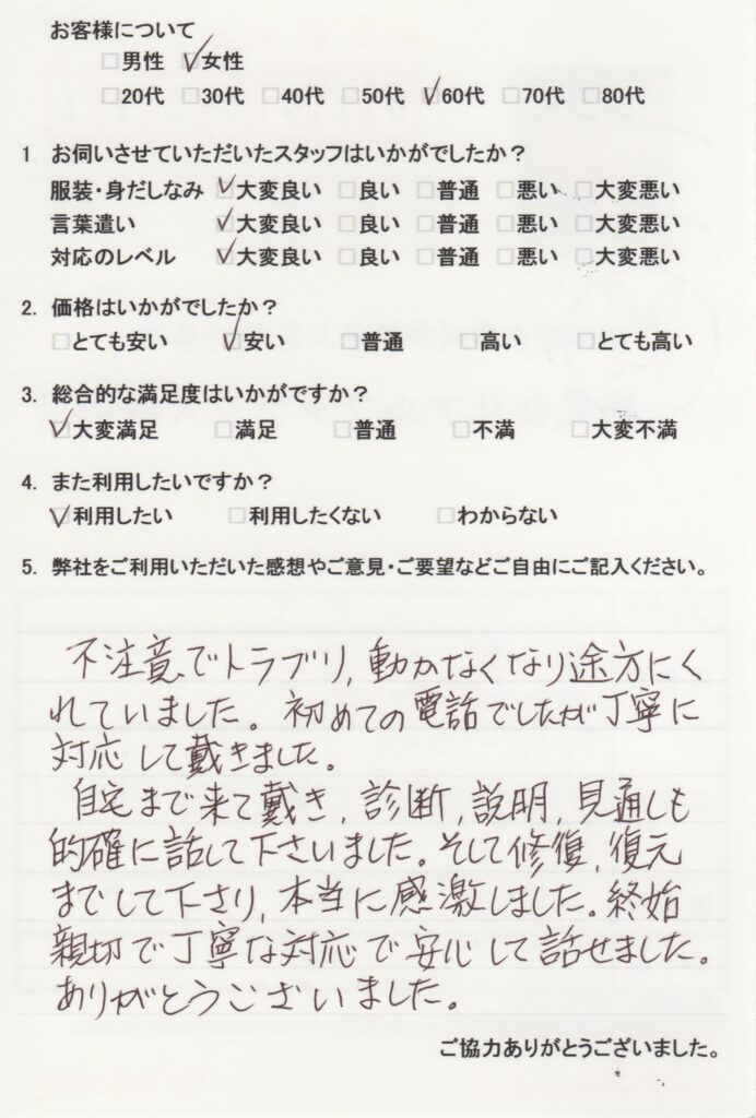 不注意でトラブり、動かなくなり途方にくれてました。初めての電話でしたが丁寧に対応して戴きました。自宅まで来て戴き、診断、説明、見通しも的確に話して下さいました。そして修復、復元までして下さり、本当に感激しました。終始親切で丁寧な対応で安心して話せました。ありがとうございました。