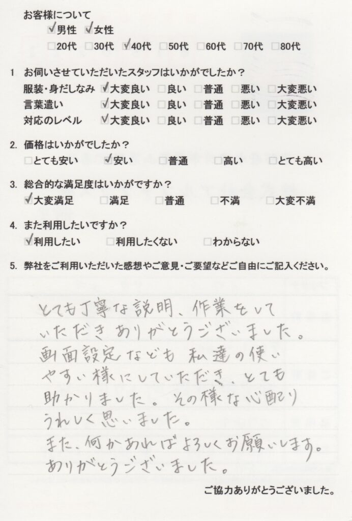 とても丁寧な説明、作業をしていただきありがとうございました。画面設定なども私達の使いやすい様にしていただき、とても助かりました。その様な心配り、うれしく思いました。また、何かあればよろしくお願いします。ありがとうございました。 -