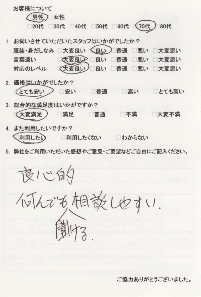初めて、利用させていただきました。大変、親切に、又、きっちりと作業の方して頂いたと思います。わからない事も丁寧に対応下さいました。又、トラブルありましたら、御社を利用したいと思います。 -