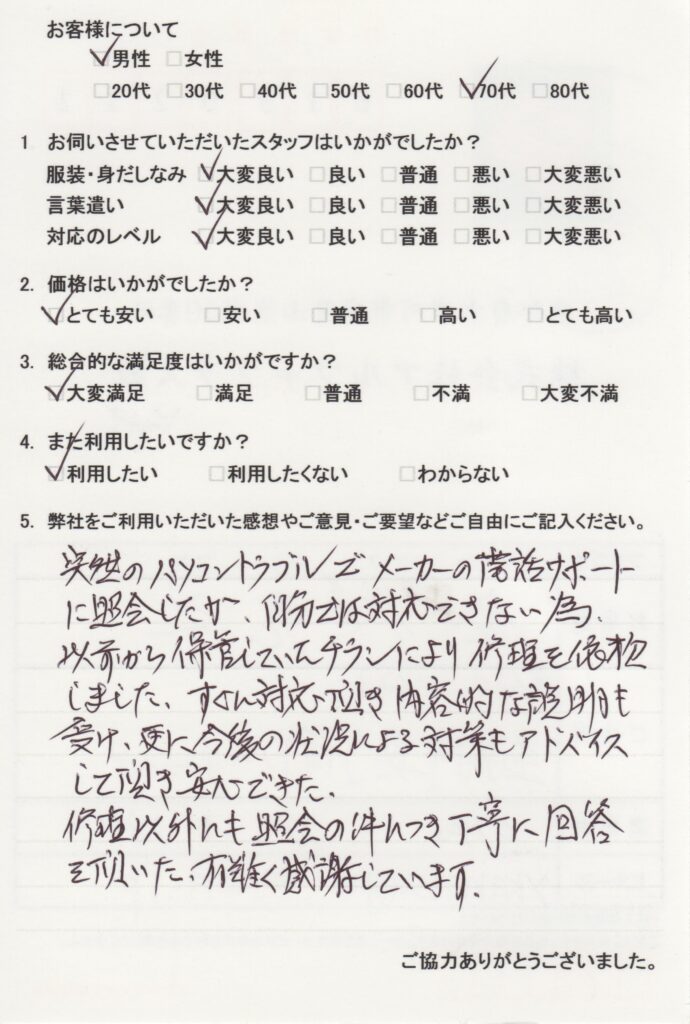 突然のパソコントラブルでメーカーの電話サポートに照会したが、自分では対応できない為、以前から保管していたチラシにより修理を依頼しました。すぐに対応頂き、内容的な説明も受け、更に今後の状況による対策もアドバイスして頂き安心できた。修理以外にも紹介の件につき丁寧に回答を頂いた。有難く感謝しています。 -