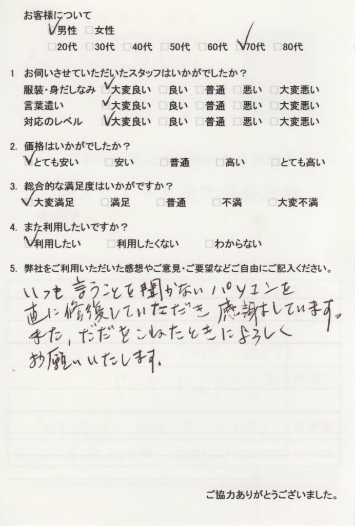 いつも言うことを聞かないパソコンを直に修復していただき感謝しています。また、だだをこねたときによろしくお願いいたします。 -