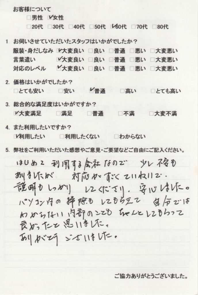 はじめて利用する会社なので、少し不安もありましたが、対応がすごくていねいで、説明もしっかりしてくださり、安心しました。パソコン内の掃除もしてもらえ自分ではわからない内部のこともちゃんとしてもらって良かったと思いました。ありがとうございました。 -