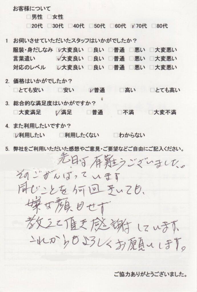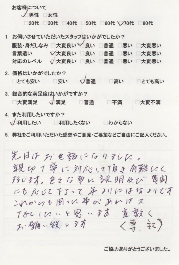 先日はお世話になりました。親切丁寧に対応して頂き有難たく存じます。色々な事に説明及び質問にも応じて下さって年よりには何よりです。これからも困ったことがあれば又、TELしたいと思います。宜しくお願い致します。 -