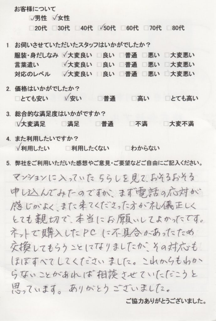マンションに入っていたちらしを見て、おそるおそる申し込んでいたのですが、まず電話の対応が感じがよく、また来てくださった方が礼儀正しくとても親切で、本当にお願いしてよかったです。ネットで購入したPCに不具合があったため交換してもらうことになりましたが、その対応もほぼすべてしてくださいました。これからもわからないことがあれば相談させていただこうと思っています。ありがとうございました。 -