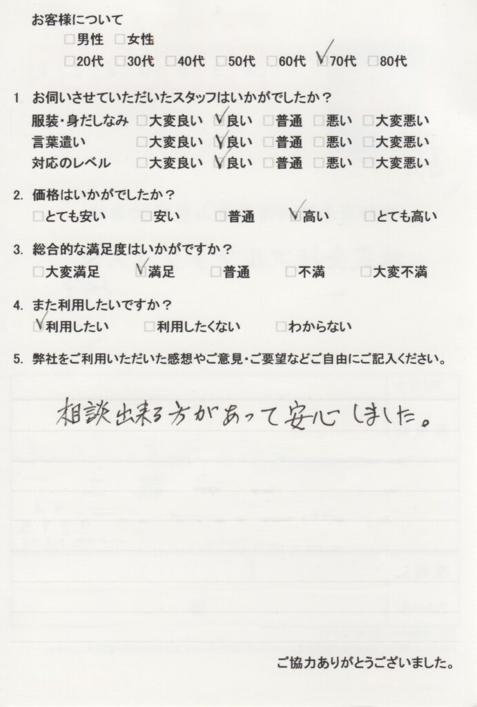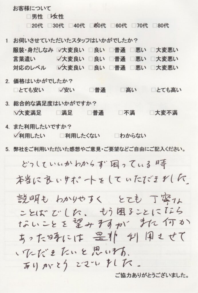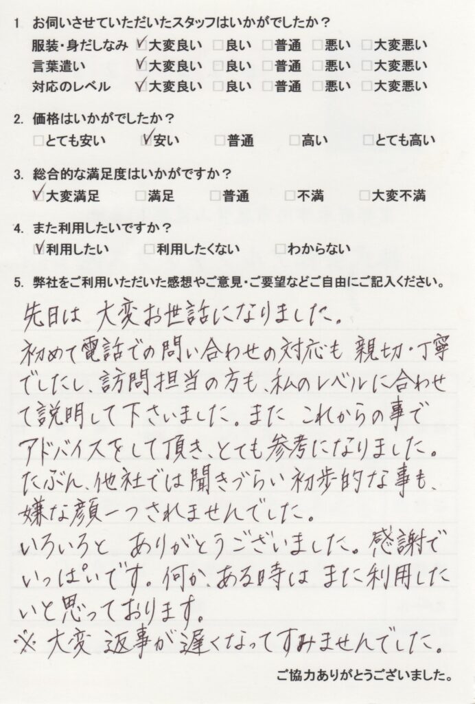 先日は、大変お世話になりました。初めて電話での問い合わせの対応も、親切・丁寧でしたし、訪問担当の方も、私のレベルに合わせて説明して下さいました。また、これからの事でアドバイスをして頂き、とても参考になりました。たぶん、他社では聞きづらい初歩的な事も、嫌な顔一つされませんでした。いろいろとありがとうございました。感謝でいっぱいです。何か、ある時は、また利用したいと思っております。 -