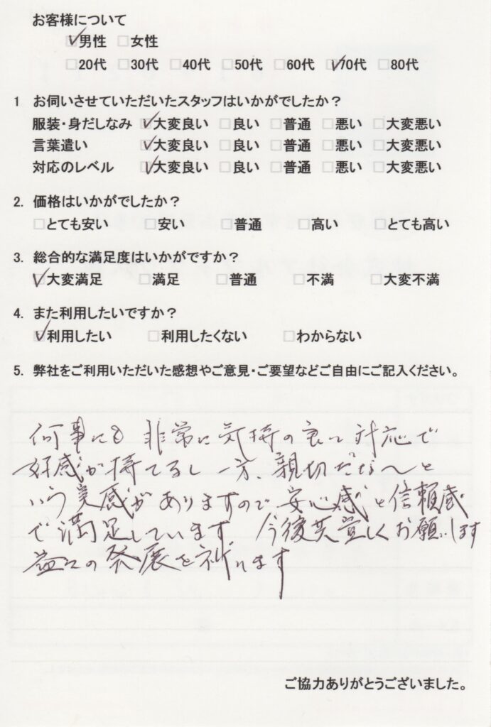 何事にも非常に気持の良い対応で好感が持てるし一方、親切だな~という実感がありますので安心感と信頼感で満足しています。今後共宜しくお願いします。益々の発展を祈ります。 -