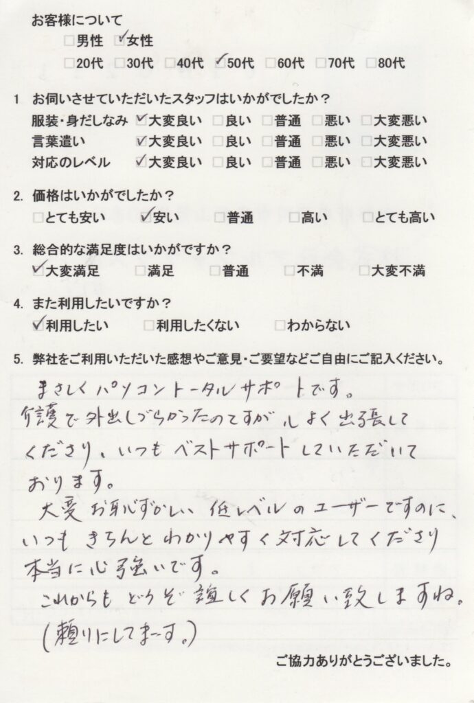まさしくパソコントータルサポートです。介護で外出しづらかったのですが、心よく出張してくださり、いつもベストサポートしていただいております。大変お恥ずかしい低レベルユーザーですのに、いつもきちんとわかりやすく対応してくださり本当に心強いです。これからもどうぞ宜しくお願い致しますね。(頼りにしてます。) -
