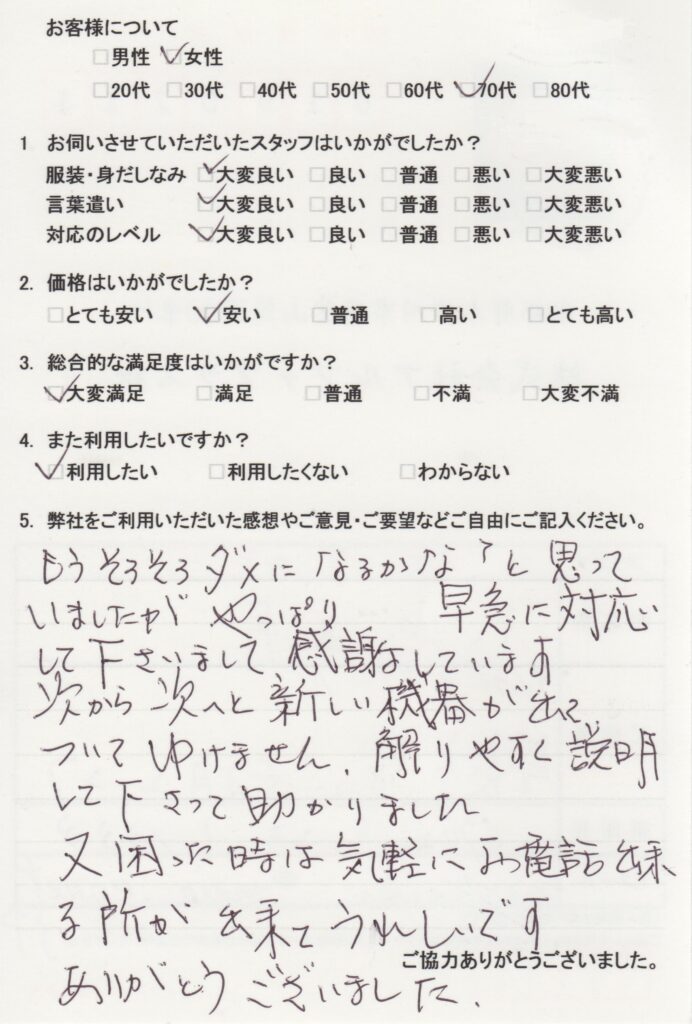 もうそろそろダメになるかな?と思っていましたがやっぱり・・・。 早急に対応して下さいまして感謝しています。次から次へと新しい機器が出てついてゆけません。解りやすく説明して下さって助かりました。又、困った時には気軽にお電話出来る所が出来てうれしいです。ありがとうございました。 -