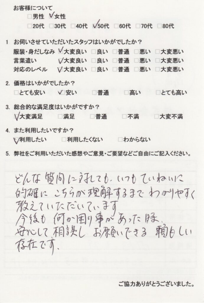 どんな質問に対しても、いつもていねいに的確に、こちらが理解するまでわかりやすく教えていただいています。今後も何か困り事があった時、安心して相談し、お願いできる、頼もしい存在です。 -